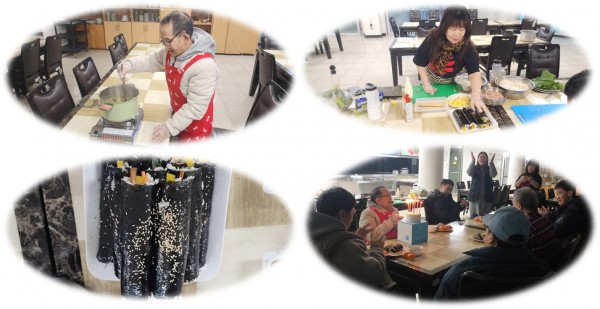드디어 저녁 시간이 되어, 유○원님과 동그라미 봉사단 회장님이 함께 정성껏 준비한 참치김밥을 국장님을 비롯한 여러 직원분들, 그리고 거주B팀 이용인분들과 함께 나누어 먹었습니다.